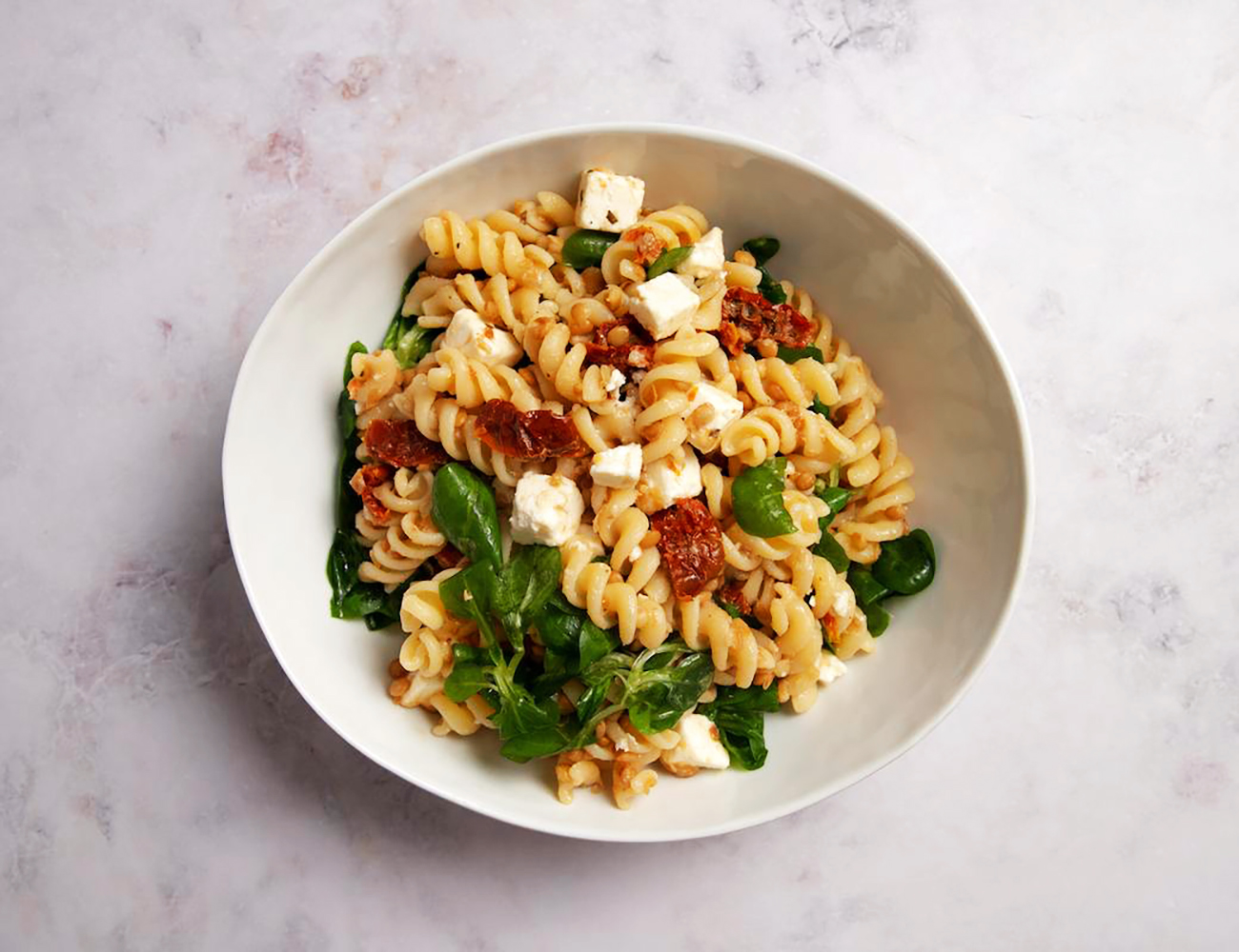 Una ensalada robusta y llena de vitalidad donde la pasta y las lentejas se entrelazan con verduras frescas y una vinagreta vibrante. Los Fusilli Garofalo, con su forma espiral que captura cada ingrediente, son la base perfecta para un plato completo, nutritivo y lleno de color, ideal para cualquier ocasión.